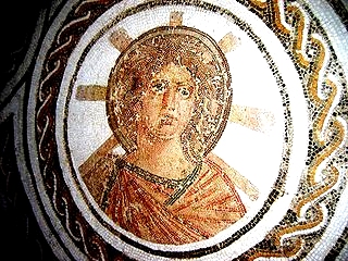Bild links: Der Sonnengott Helios wurde mit 7 Kopfstrahlen als Gott kenntlich gemacht Bild rechts: Jesus Christus wird auf manchen Bildern ebenfalls mit einem solchen 7 strahligen Kranz dargestellt (Christus Helios), hier mit einem Pferdegespann. Dieses Mosaik aus der Mitte des 3. Jh. findet sich im Mausoleum des Julius im Petersdom, Rom |